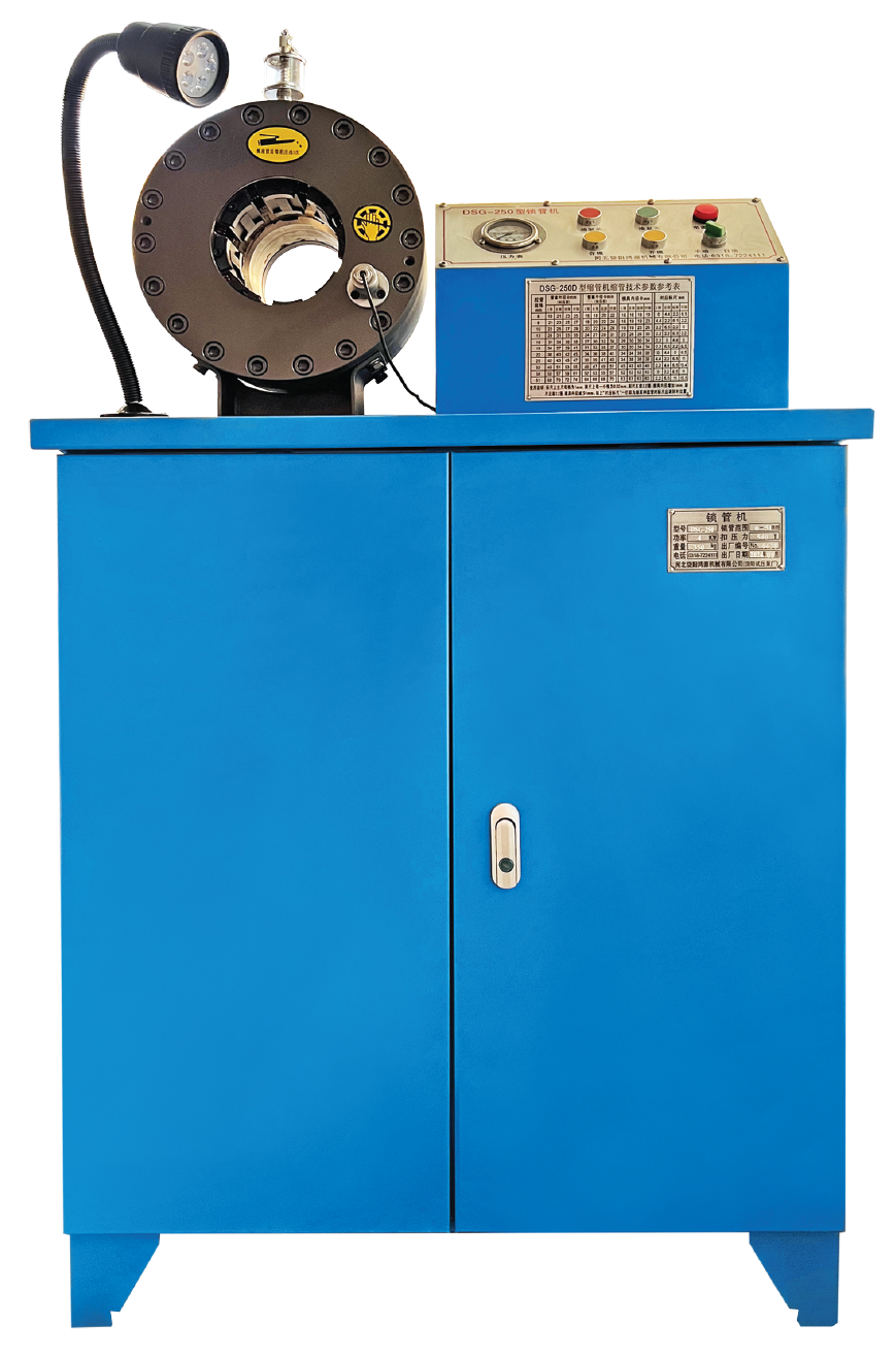 我廠生產的DSG-250C型鎖(suǒ)管機適用於工(gōng)農業和工程機械液壓傳動用(yòng)高壓膠管、纖維管、塑料管總成的扣壓加工。具有體積小(xiǎo)、重量輕、功能多、開模快、易操作、好維(wéi)修等優點(diǎn)。